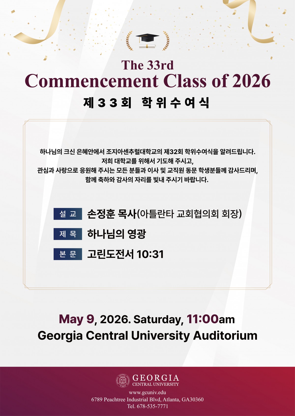 The 33rd Commencement Class of 2026 페이지 정보 Writer Manager Date26-04-11 21:03 Hit31 본문 제 33회 조지아센추럴대학교 학위 수여식 Comments No Comments. Next List